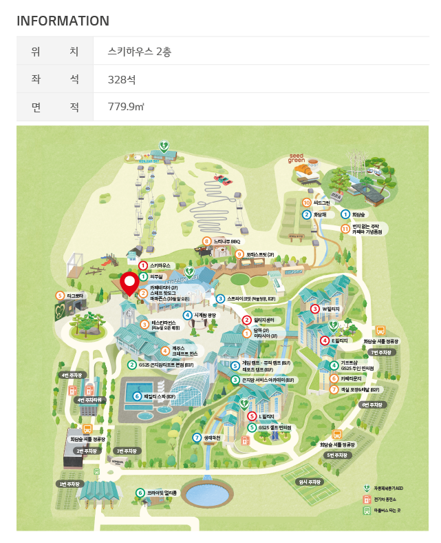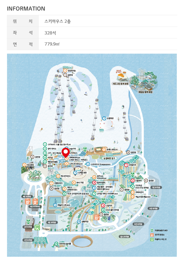 부대시설 위치 : 중앙 시계탑 광장 뒤쪽 스키하우스 건물에 의무실이 있고, 바로 아래쪽 건물에 GS25(B1F)가 위치해있습니다.