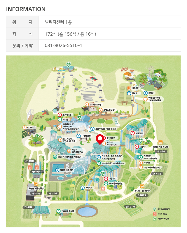 자동제세동기 AED 위치 : 의무실 및 2번 주차장, 곤돌라 하늘공원, L빌리지, E빌리지 쪽에 위치해있습니다.