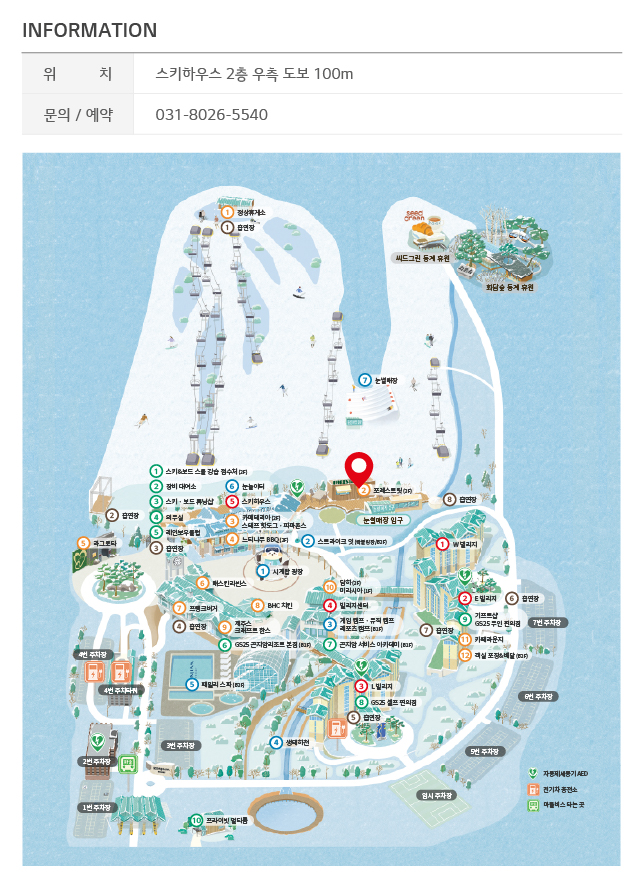 부대시설 위치 : 중앙 시계탑 광장 뒤쪽 스키하우스 건물에 의무실이 있고, 바로 아래쪽 건물에 GS25(B1F)가 위치해있습니다.