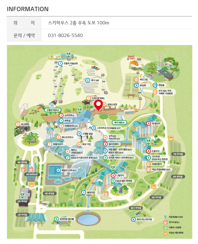 빌리지센터 기준으로 상단에는 스키하우스가, 우측으로는 W빌리지, E빌리지가 위치해있습니다.
