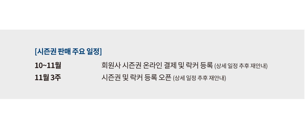 10월부터 11월까지는 회원사 시즌권 온라인 결제 및 락커 등록 기간으로, 상세 일정은 추후 재안내 예정입니다.